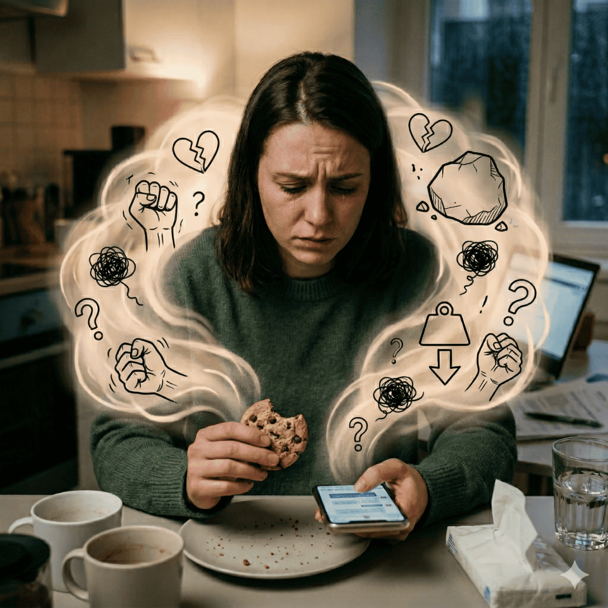 Tu rentres chez toi après une journée difficile. Tu n’as pas faim — ou presque pas. Mais avant même d’avoir posé ton sac, tu te retrouves devant le placard. Ou le frigo. Tu manges. Parfois debout, parfois sans vraiment goûter. Et après, cette sensation familière : la honte, la colère contre toi-même, le « pourquoi j’ai encore fait ça ».